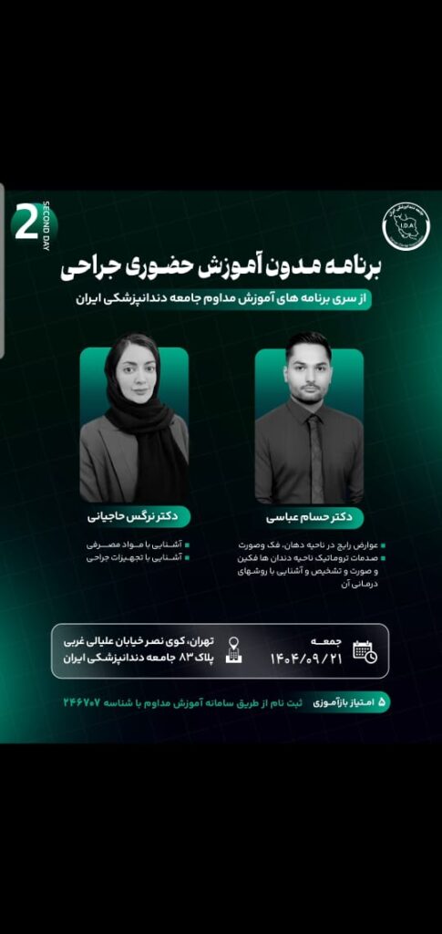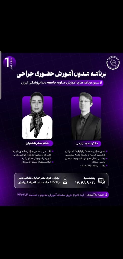 برنامه مدون آموزش حضوری جراحی، از سری برنامههای آموزش مداوم جامعه دندانپزشکی ایران روزهای پنجشنبه و جمعه ۲۰ و ۲۱ آذر ماه ۱۴۰۴ در محل جامعه دندانپزشکی ایران و با تدریس