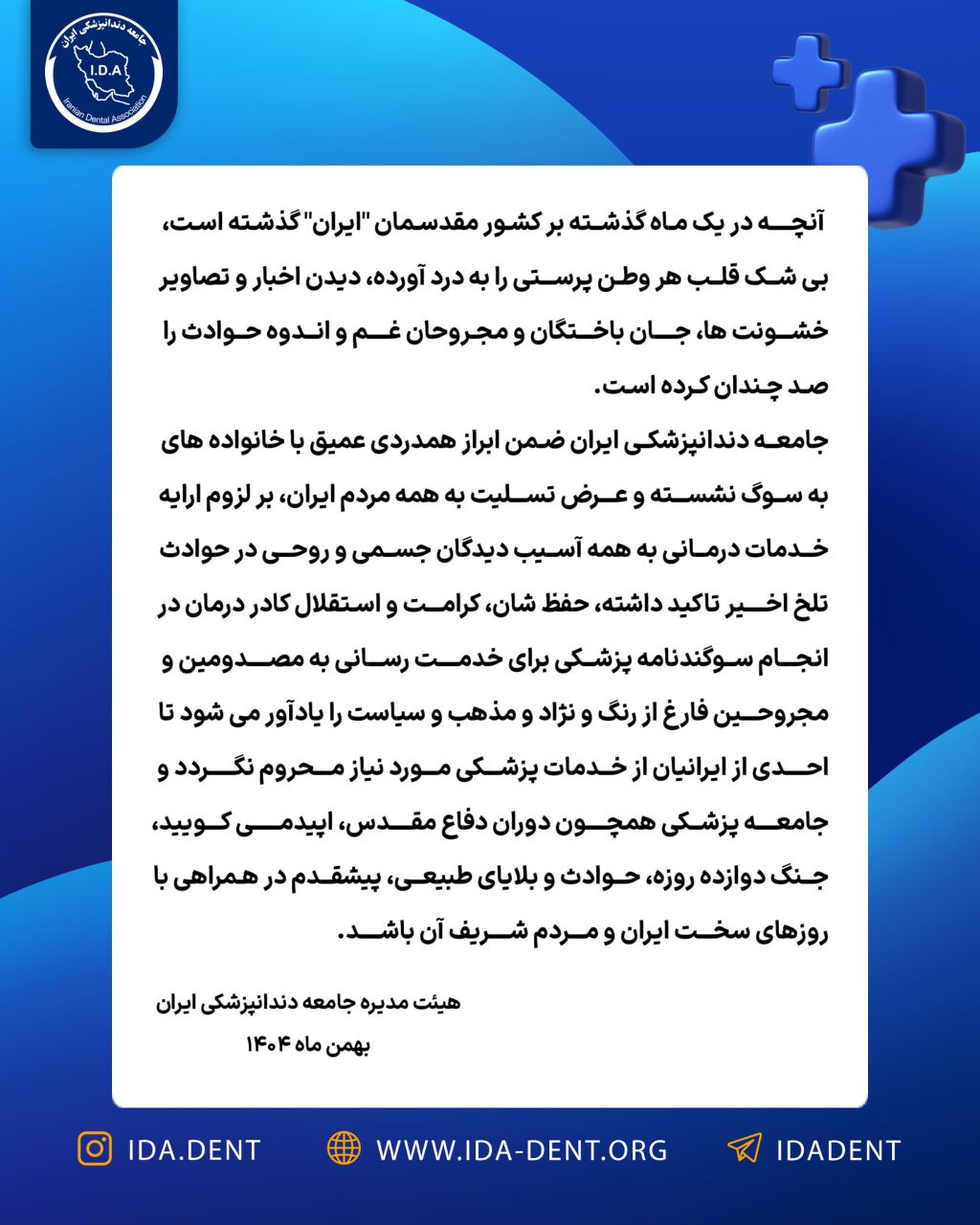 جامعه دندانپزشکی ایران ضمن ابراز همدردی عمیق با خانواده های به سوگ نشسته و عرض تسلیت به همه مردم ایران، بر لزوم ارایه خدمات درمانی به همه آسیب دیدگان جسمی و روحی در حوادث تلخ اخیر تاکید داشته، حفظ شان، کرامت و استقلال کادر درمان در انجام سوگندنامه پزشکی برای خدمت رسانی به مصدومین و مجروحین فارغ از رنگ و نژاد و مذهب و سیاست را یادآور می شود تا احدی از ایرانیان از خدمات پزشکی مورد نیاز محروم نگردد و جامعه پزشکی همچون دوران دفاع مقدس، اپیدمی کویید، جنگ دوازده روزه، حوادث و بلایای طبیعی، پیشقدم در همراهی با روزهای سخت ایران و مردم شریف آن باشد.