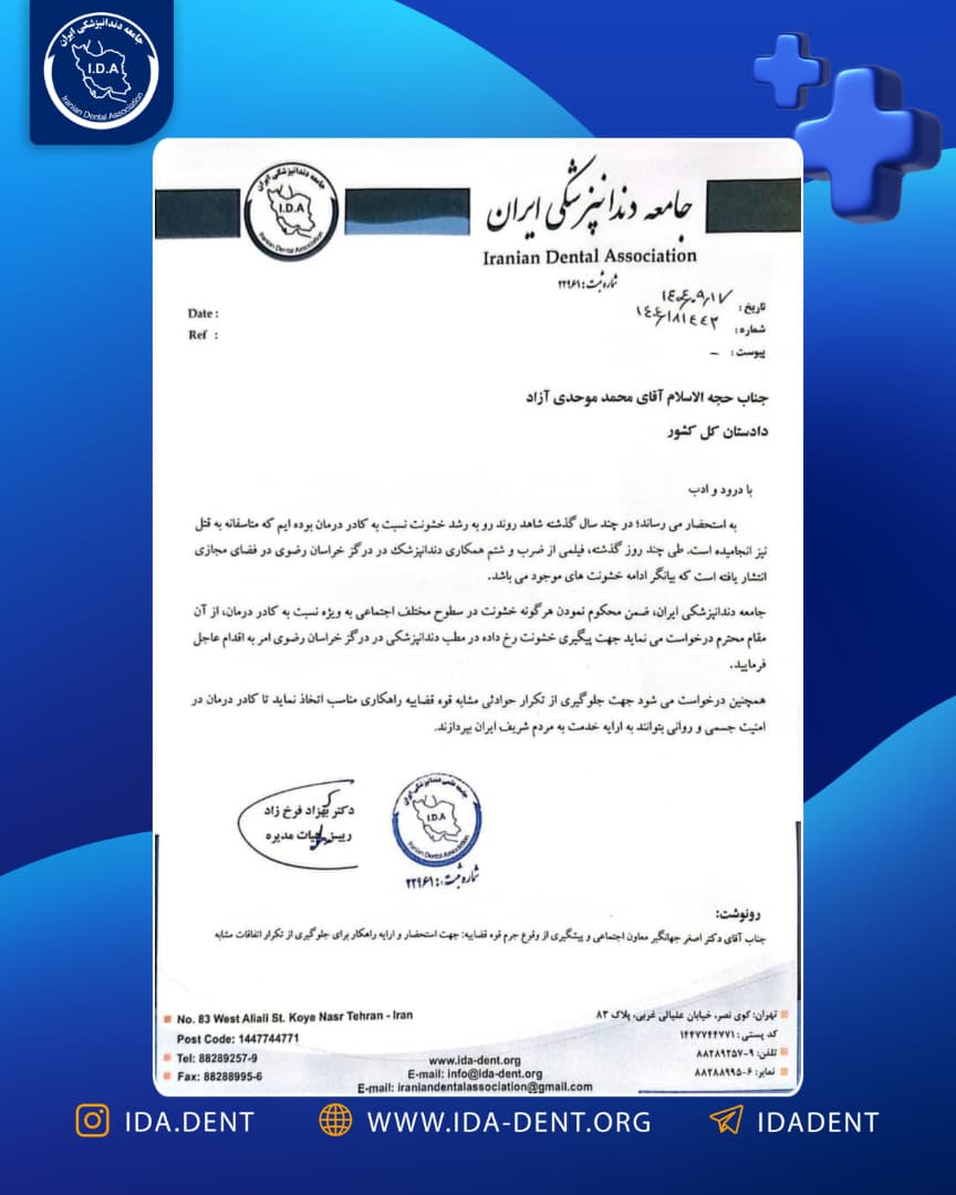 جامعه دندانپزشکی ایران طی مکاتبهای با دادستان محترم کل کشور، ضمن محکوم کردن هرگونه خشونت در سطوح مختلف اجتماعی به ویژه نسبت به کادر درمان از ایشان درخواست کرد تا در خصوص حادثه خشونت رخ داده در مطب دندانپزشکی در درگز خراسان رضوی اقدام عاجل نمایند .