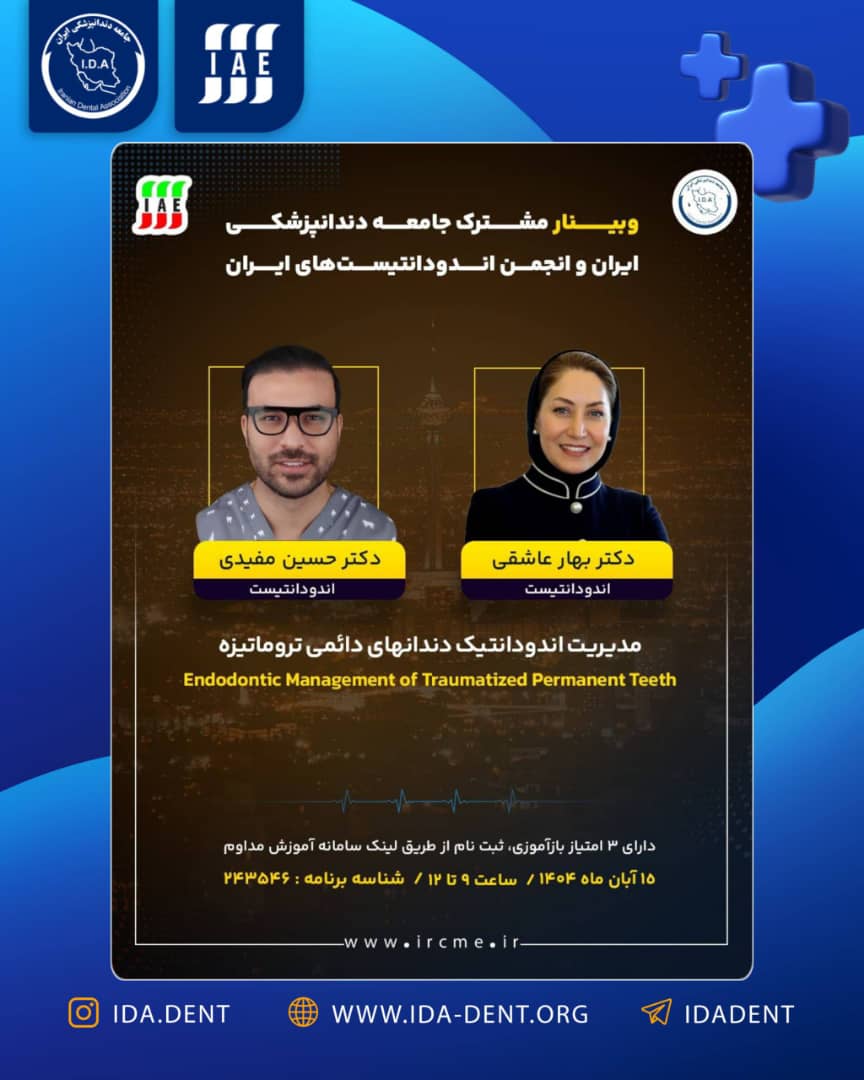 وبینار مشترک جامعه دندانپزشکی ایران و انجمن اندودانتیستهای ایران با موضوع مدیریت اندودانتیک دندانهای دائمی تروماتیزه